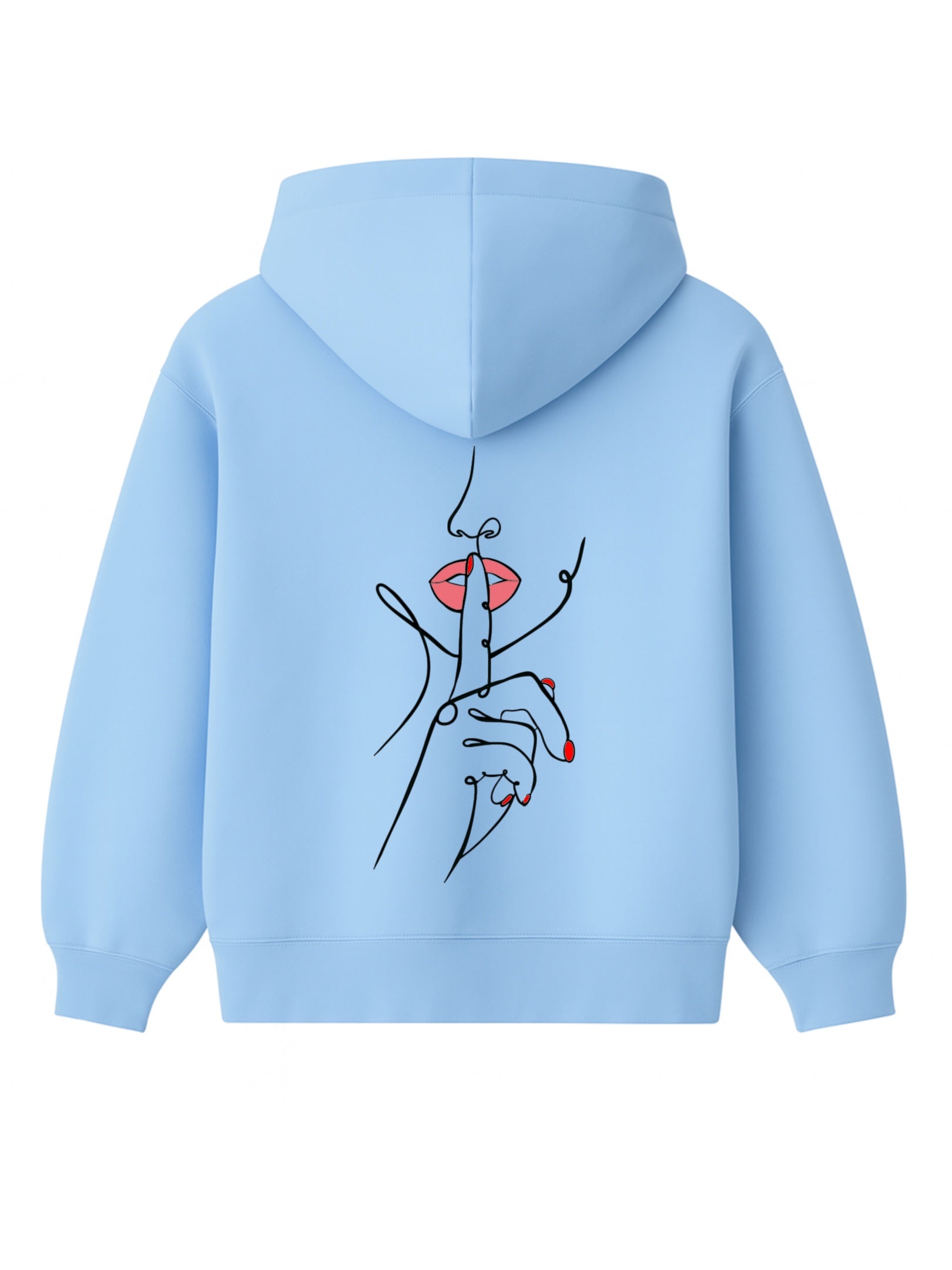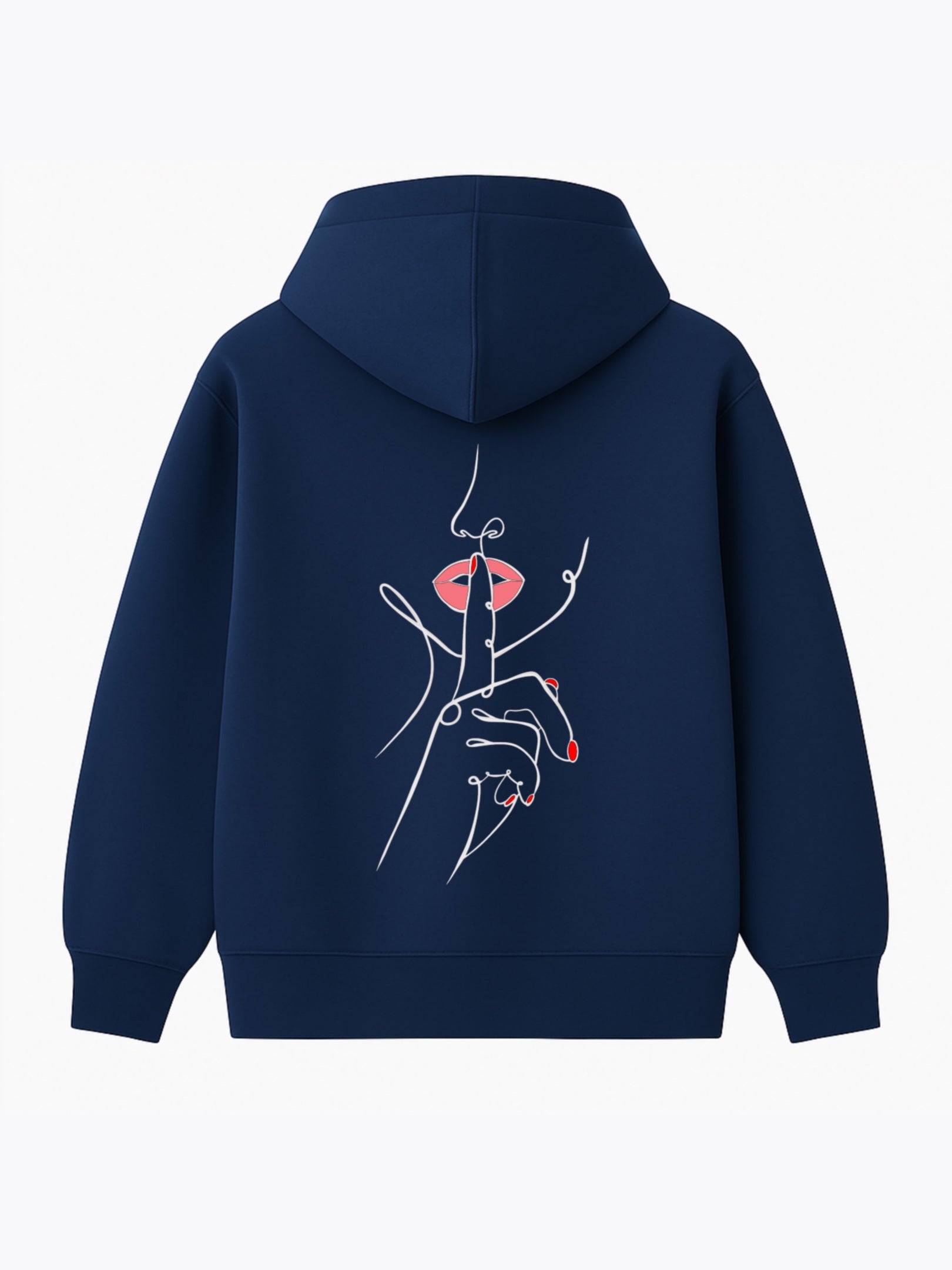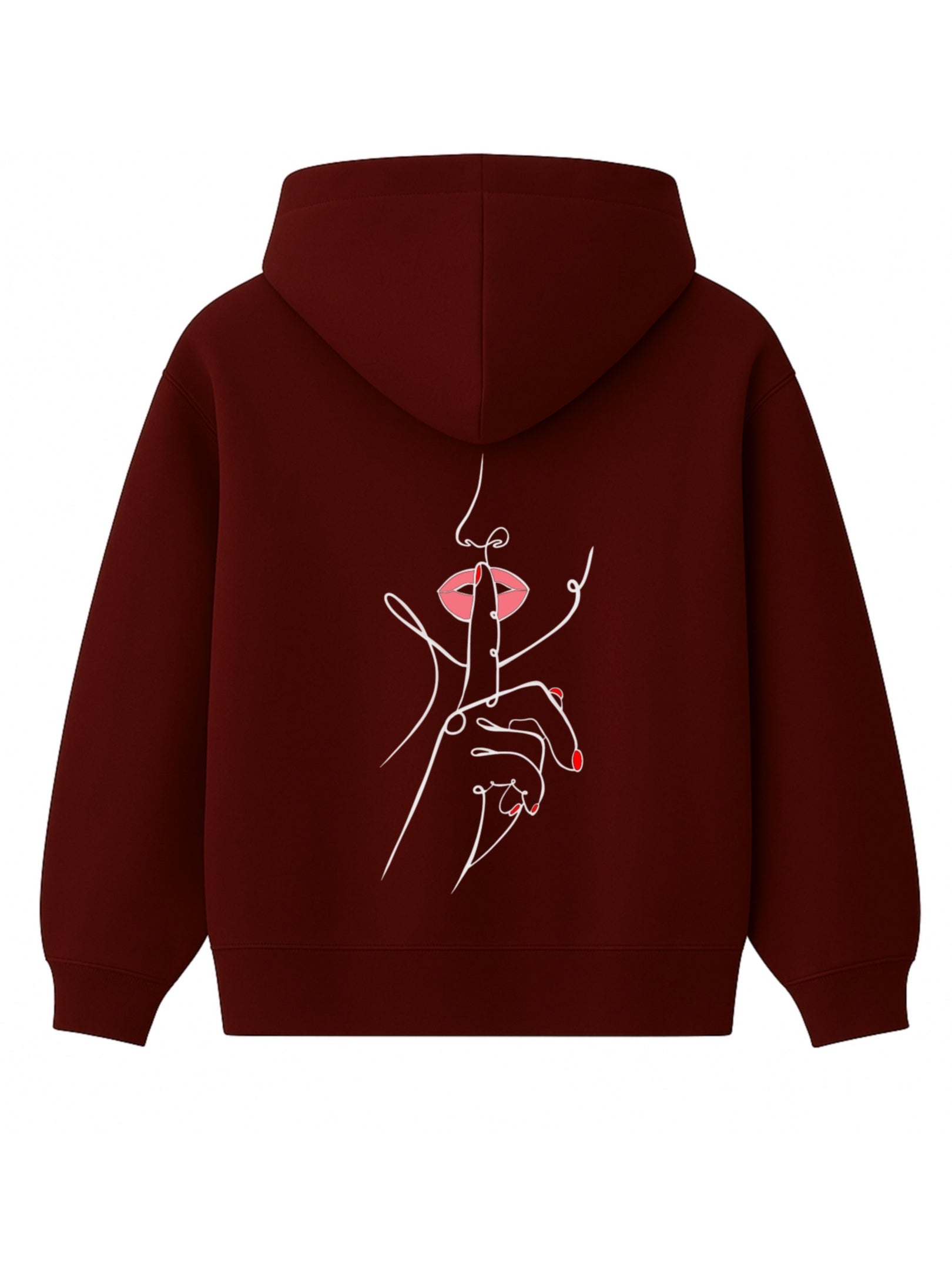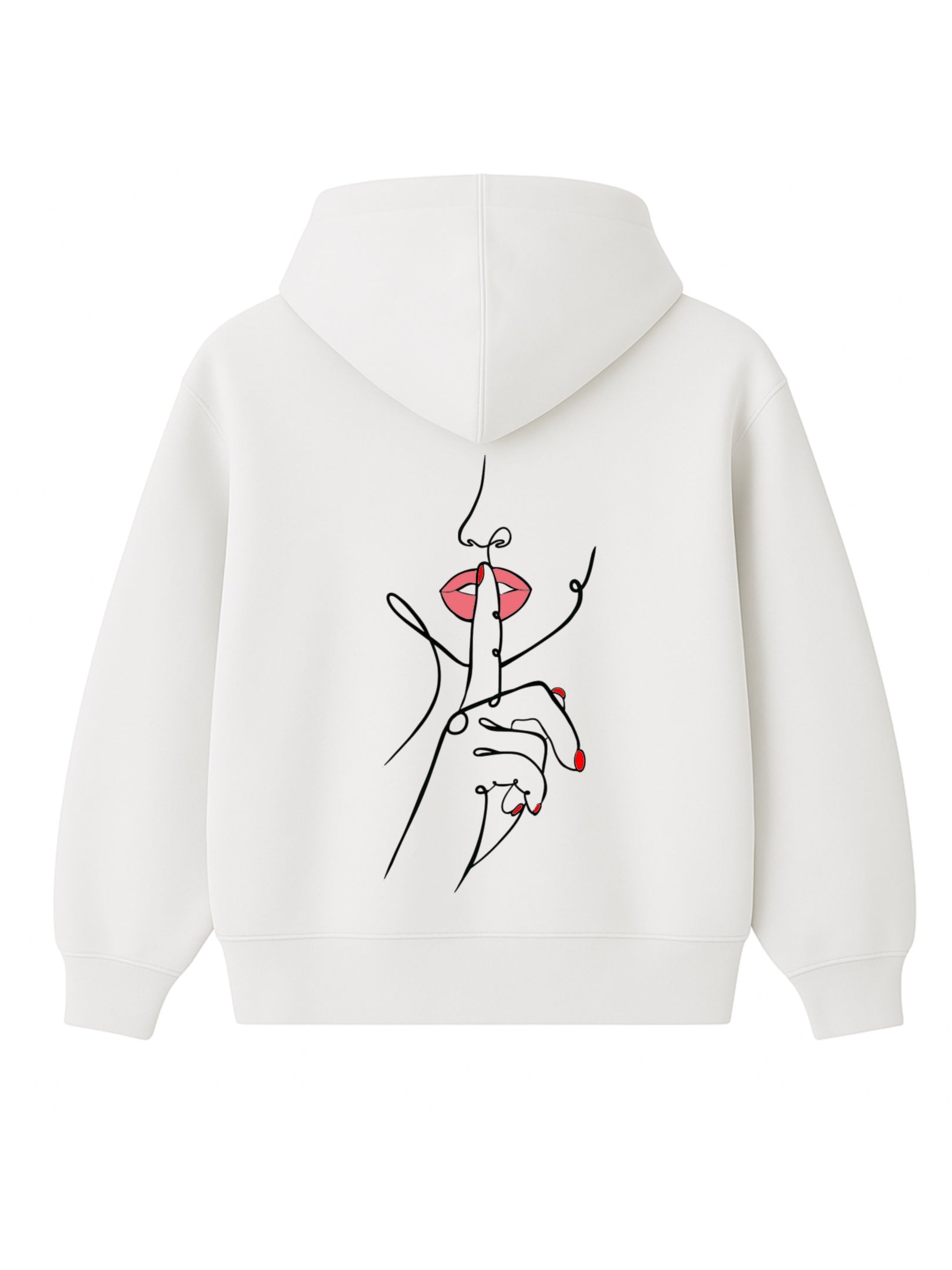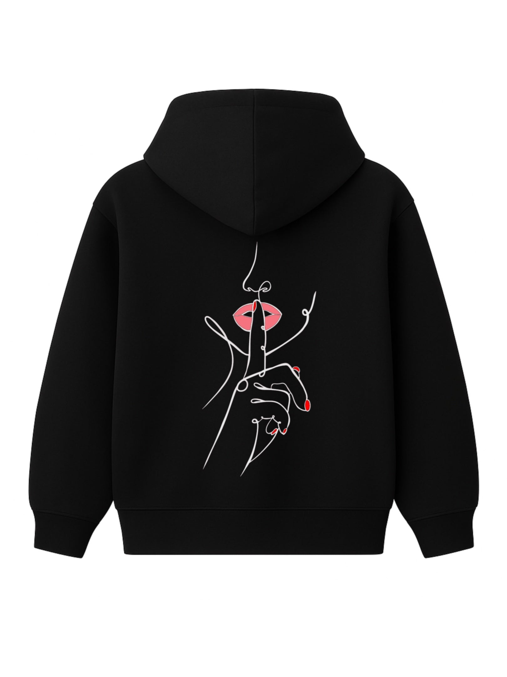 Un doigt tendu, délicat, posé sur des lèvres rouges entrouvertes. Ce n’est pas une interdiction, c’est une invitation. Une main fluide, dessinée d’un seul trait, nous demande doucement mais fermement de ralentir. Dans un monde saturé de bruit et d’images, ce geste devient un cri silencieux.