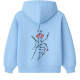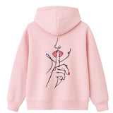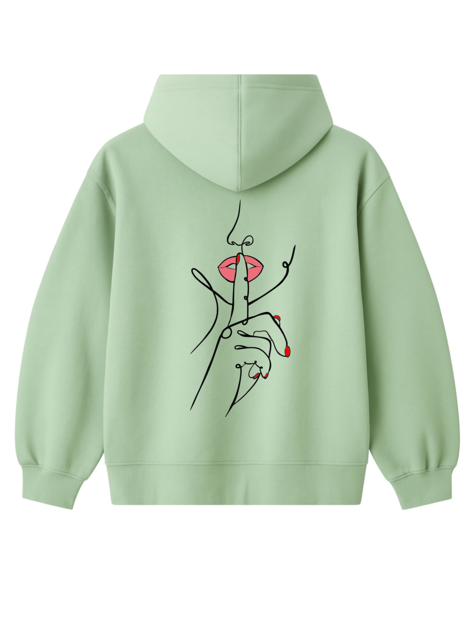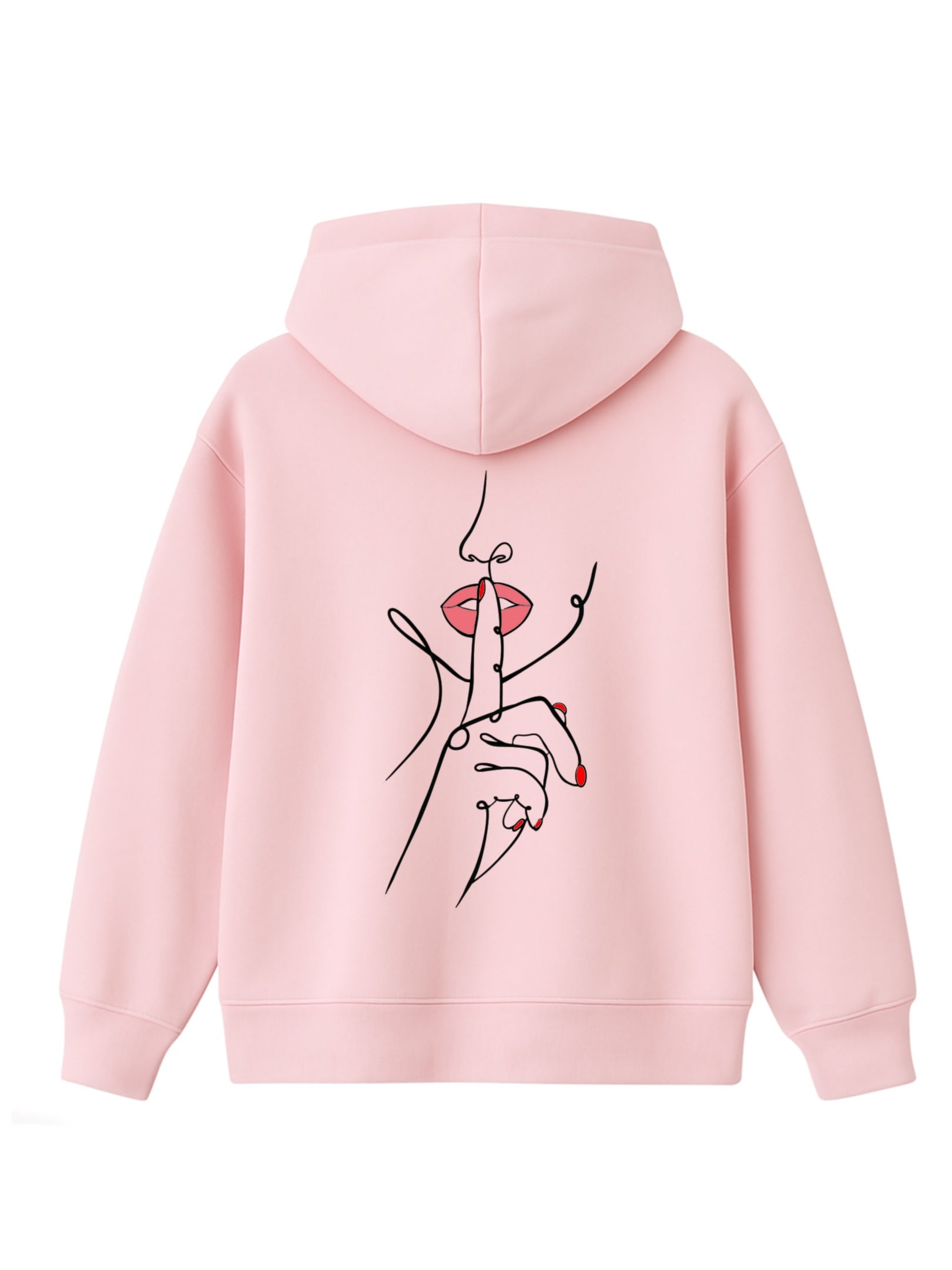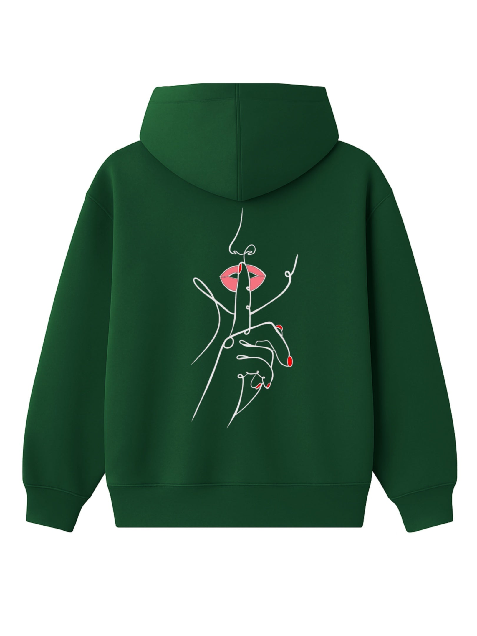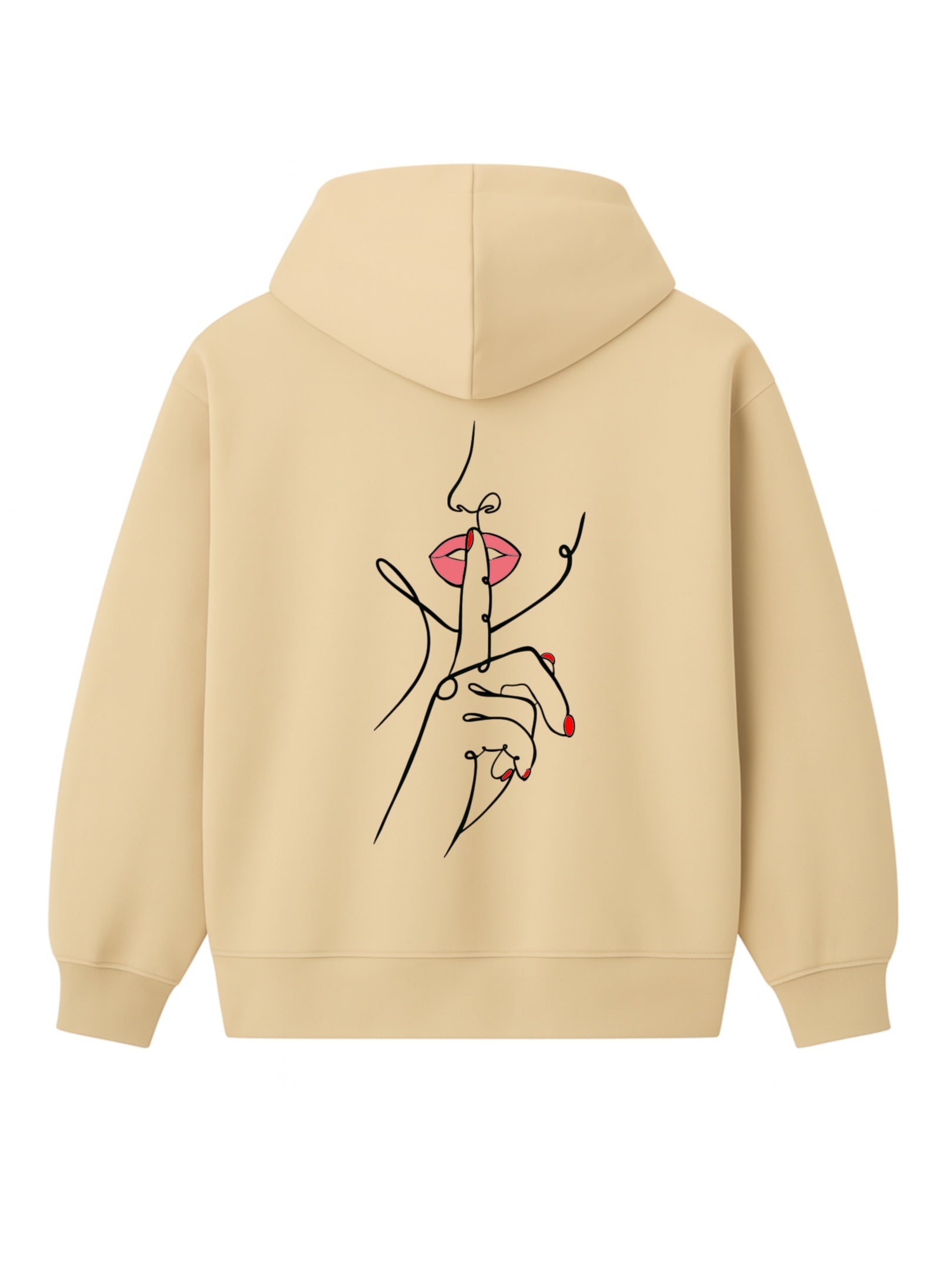 Un doigt tendu, délicat, posé sur des lèvres rouges entrouvertes. Ce n’est pas une interdiction, c’est une invitation. Une main fluide, dessinée d’un seul trait, nous demande doucement mais fermement de ralentir. Dans un monde saturé de bruit et d’images, ce geste devient un cri silencieux.