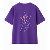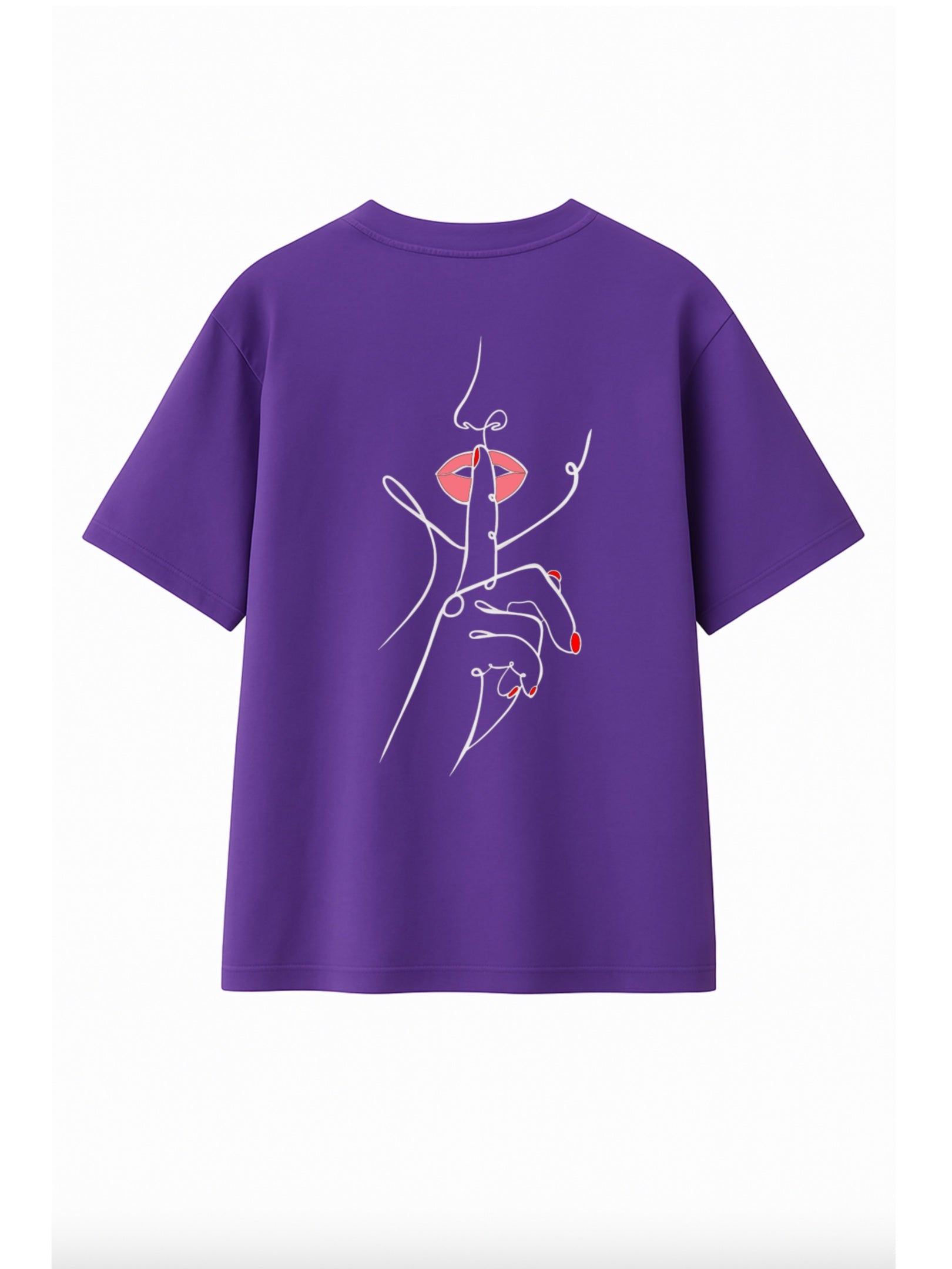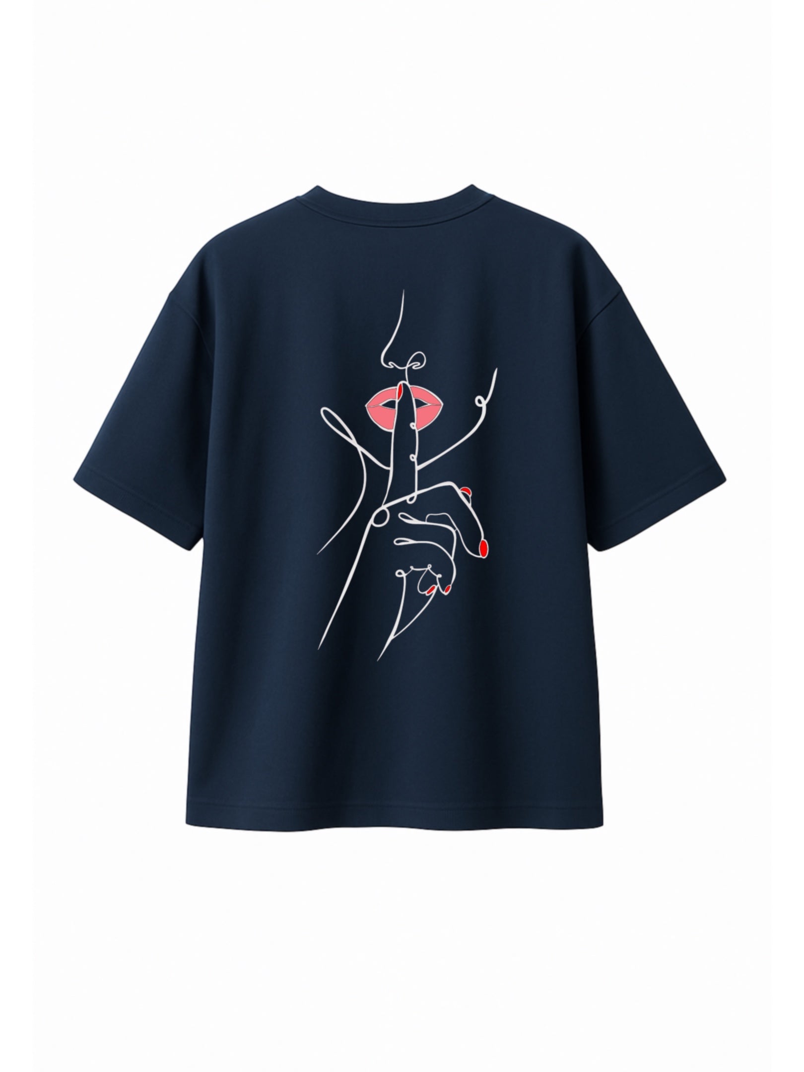 Un doigt tendu, délicat, posé sur des lèvres rouges entrouvertes. Ce n’est pas une interdiction, c’est une invitation. Une main fluide, dessinée d’un seul trait, nous demande doucement mais fermement de ralentir. Dans un monde saturé de bruit et d’images, ce geste devient un cri silencieux.