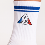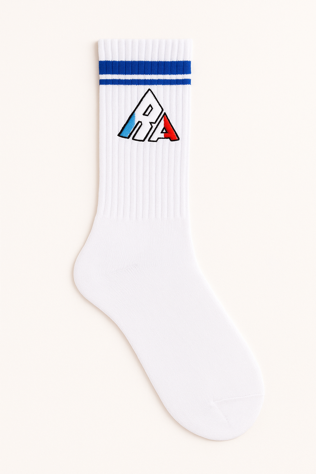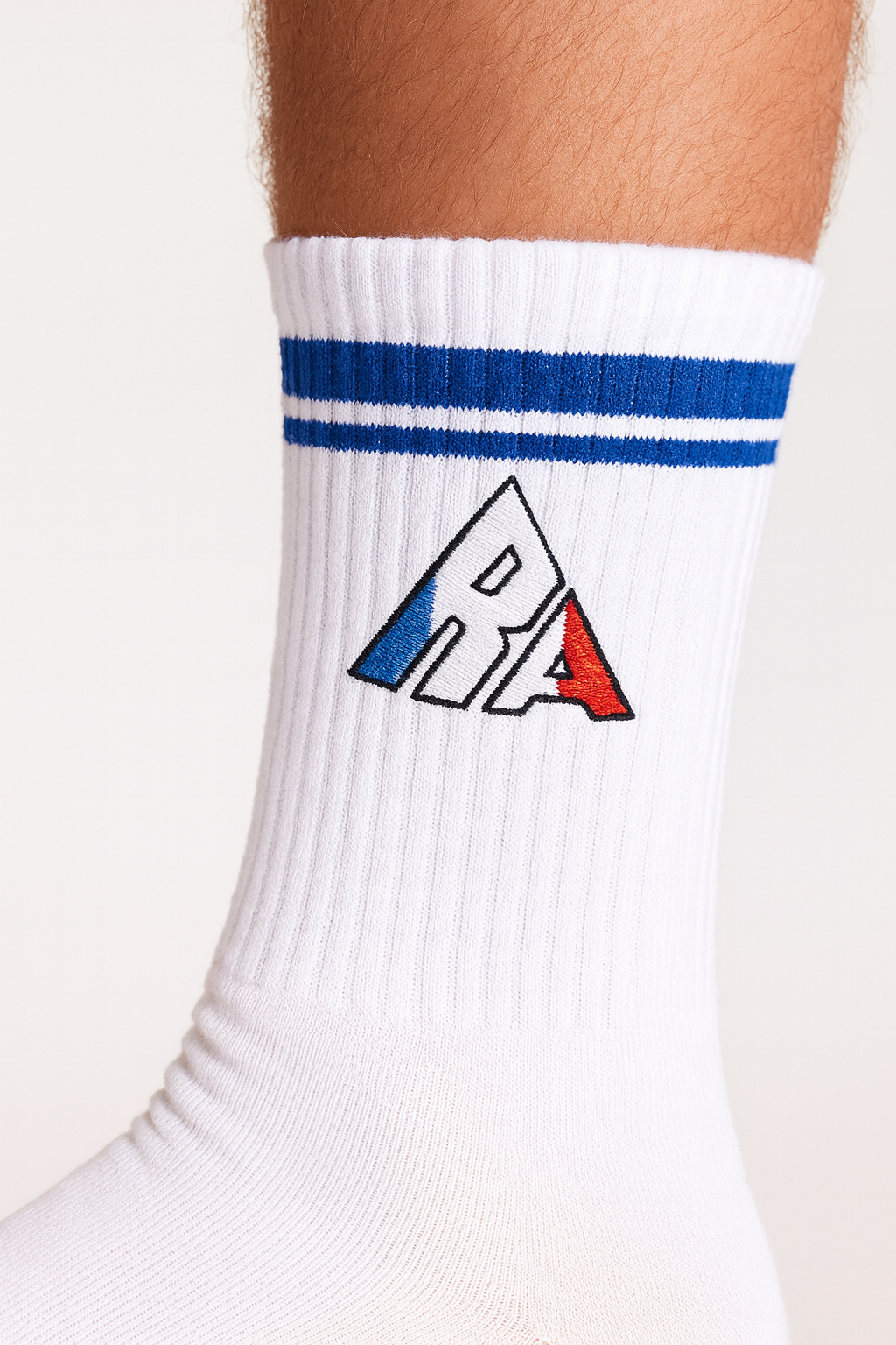 Découvrez nos chaussettes de sport brodées RA, conçues pour allier style, confort et performance. Fabriquées dans une maille respirante et durable, elles offrent un maintien optimal grâce à leur tissage côtelé et leur coupe mi-mollet.